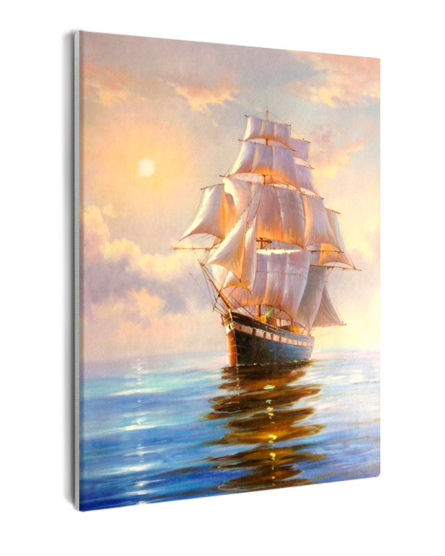Picture Description The image portraying a majestic tall ship sailing on a tranquil, deep blue sea. The ship takes center stage, presented as a silhouette with billowing sails catching the wind, and its bow directed towards the left side of the canvas. Above, the expansive sky is adorned with grand clouds, and the sun, hanging low, imparts a warm, yellow-white glow, casting an atmosphere of serene beauty over the scene. Design |