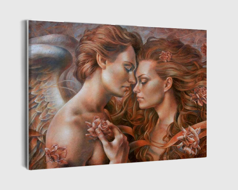Picture Description A painting portraying two red-haired angels engaging with each other. Both hold flowers, and their hair seems to sway in the wind. Against a hazy, warm-toned background, the scene exudes a dreamy and serene atmosphere. The angels, positioned intimately, either gaze into each other's eyes or touch each other's faces, creating a tender and emotional tableau. Design |